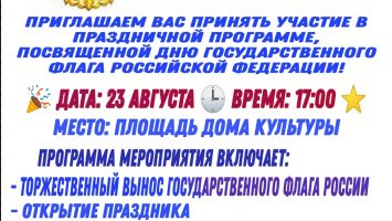 ПРИГЛАШАЕМ ВАС ПРИНЯТЬ УЧАСТИЕ В ПРАЗДНИЧНОЙ ПРОГРΑΜΜΕ, ПОСВЯЩЕННОЙ ДНЮ ГОСУДАРСТВЕННОГО ФЛАГА РОССИЙСКОЙ ФЕДЕРАЦИИ!
