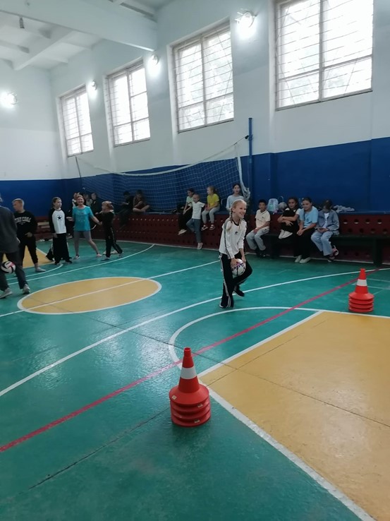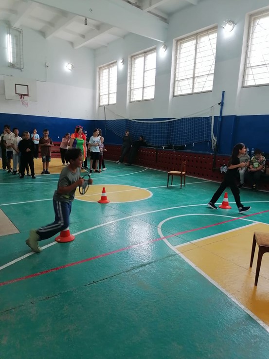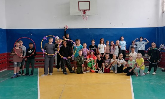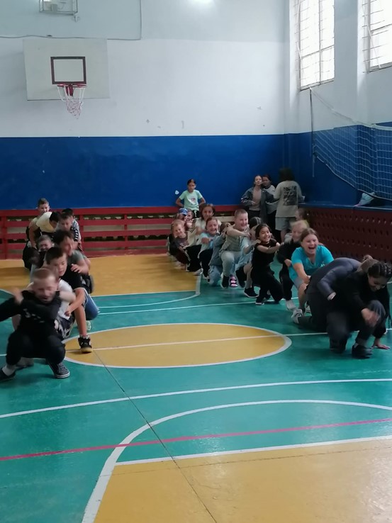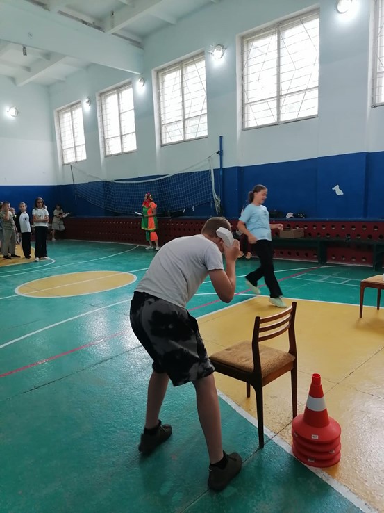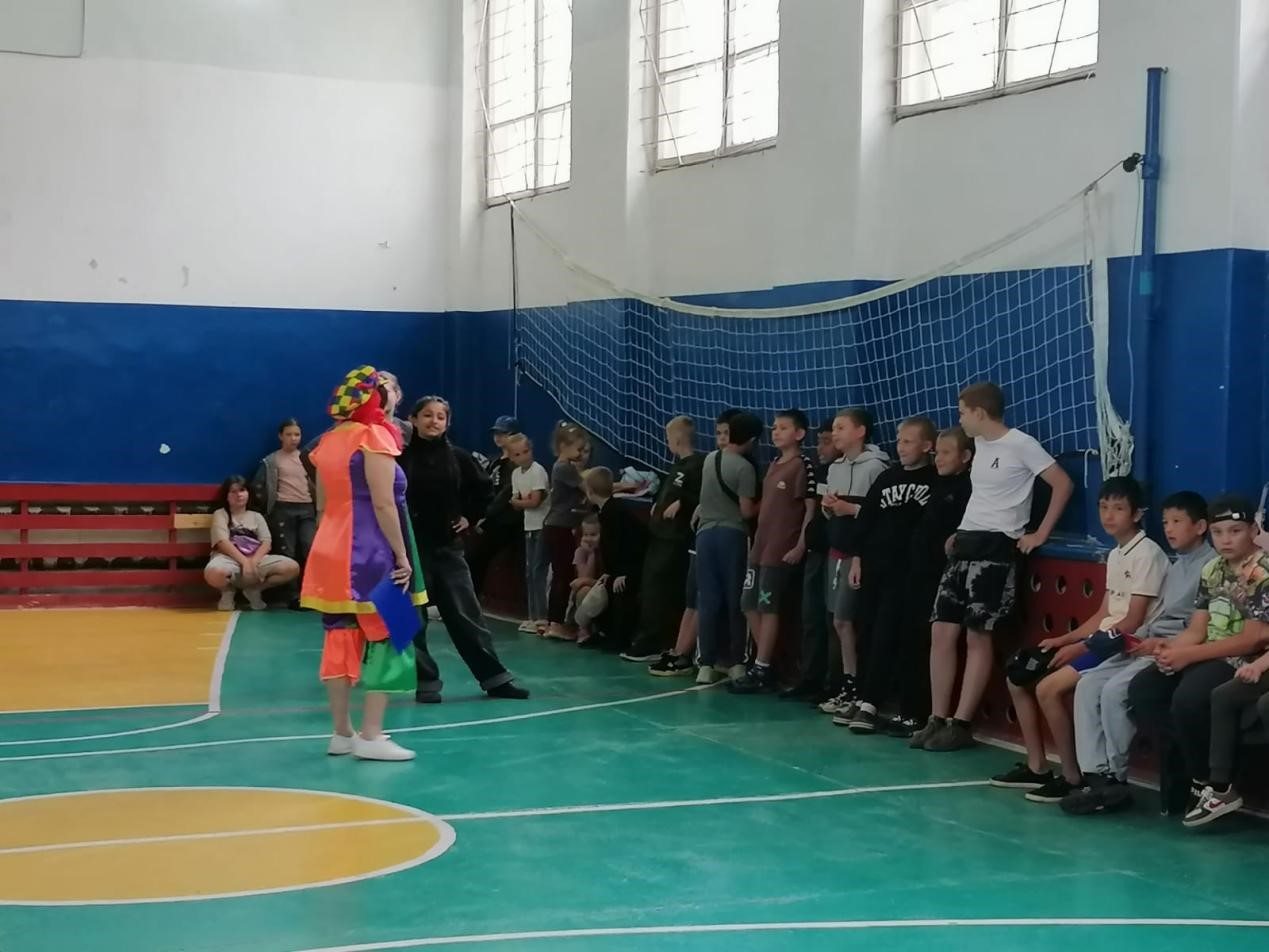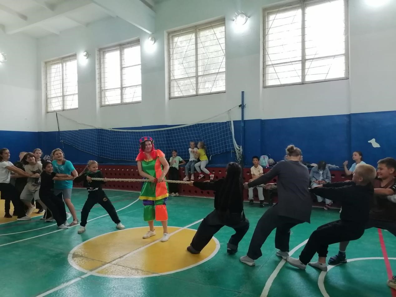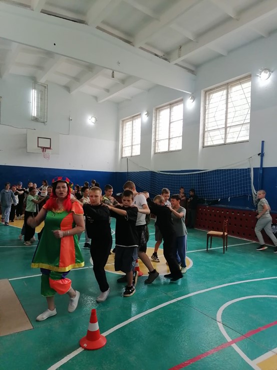 Детей ожидала веселая эстафета с играми и конкурсами, такими как бег наперегонки, прыжки через скакалку, перетягивание каната и другие подвижные задания. Клоунесса создала атмосферу праздника и радости, мотивируя ребят проявлять активность и ловкость.