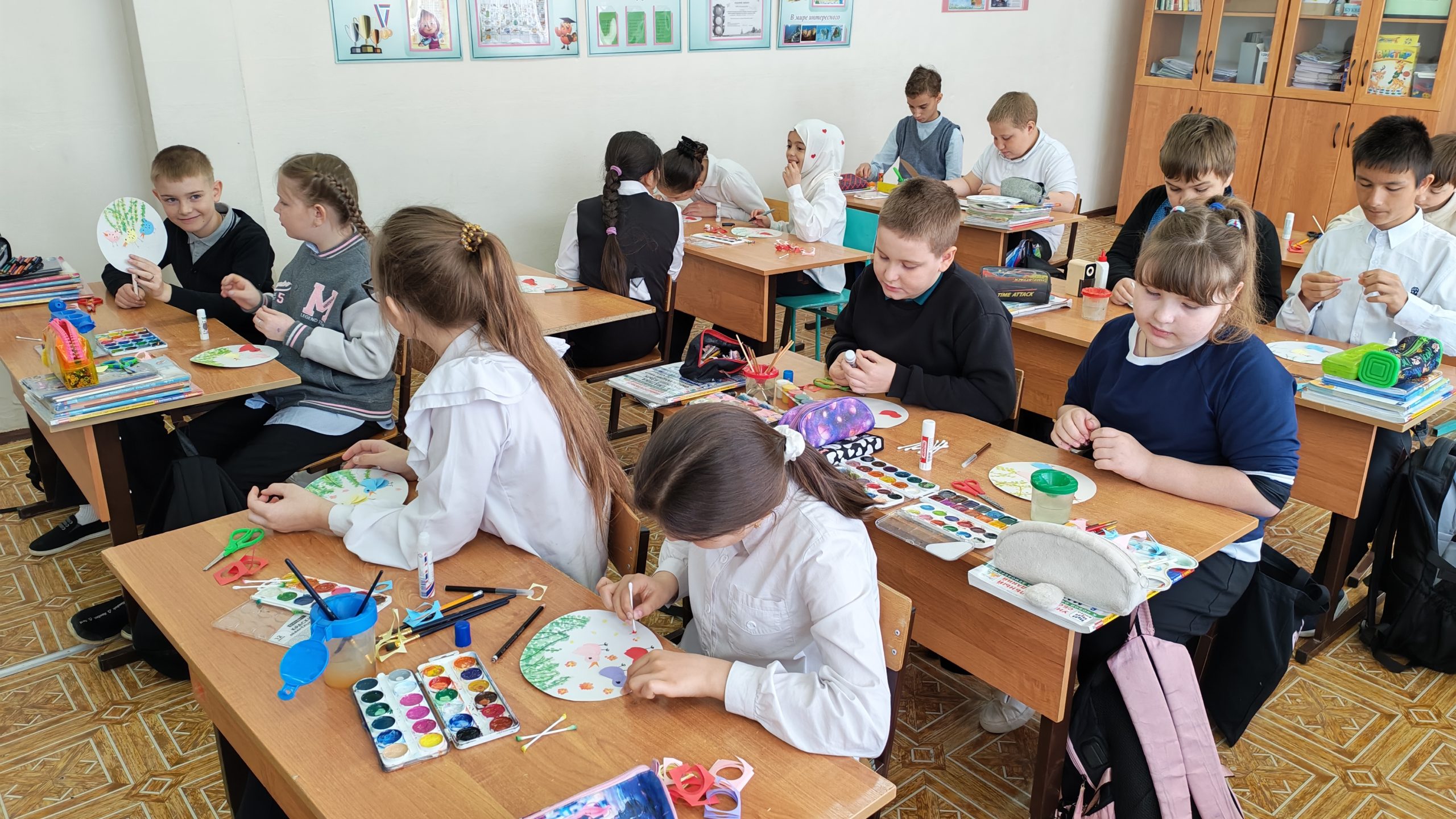 Ребята с большим интересом вырезали детали, рисовали узоры ватными палочками и аккуратно приклеивали элементы к основанию. В результате у каждого получилась оригинальная и симпатичная открытка с птичками, наполненная атмосферой праздника и творчества.